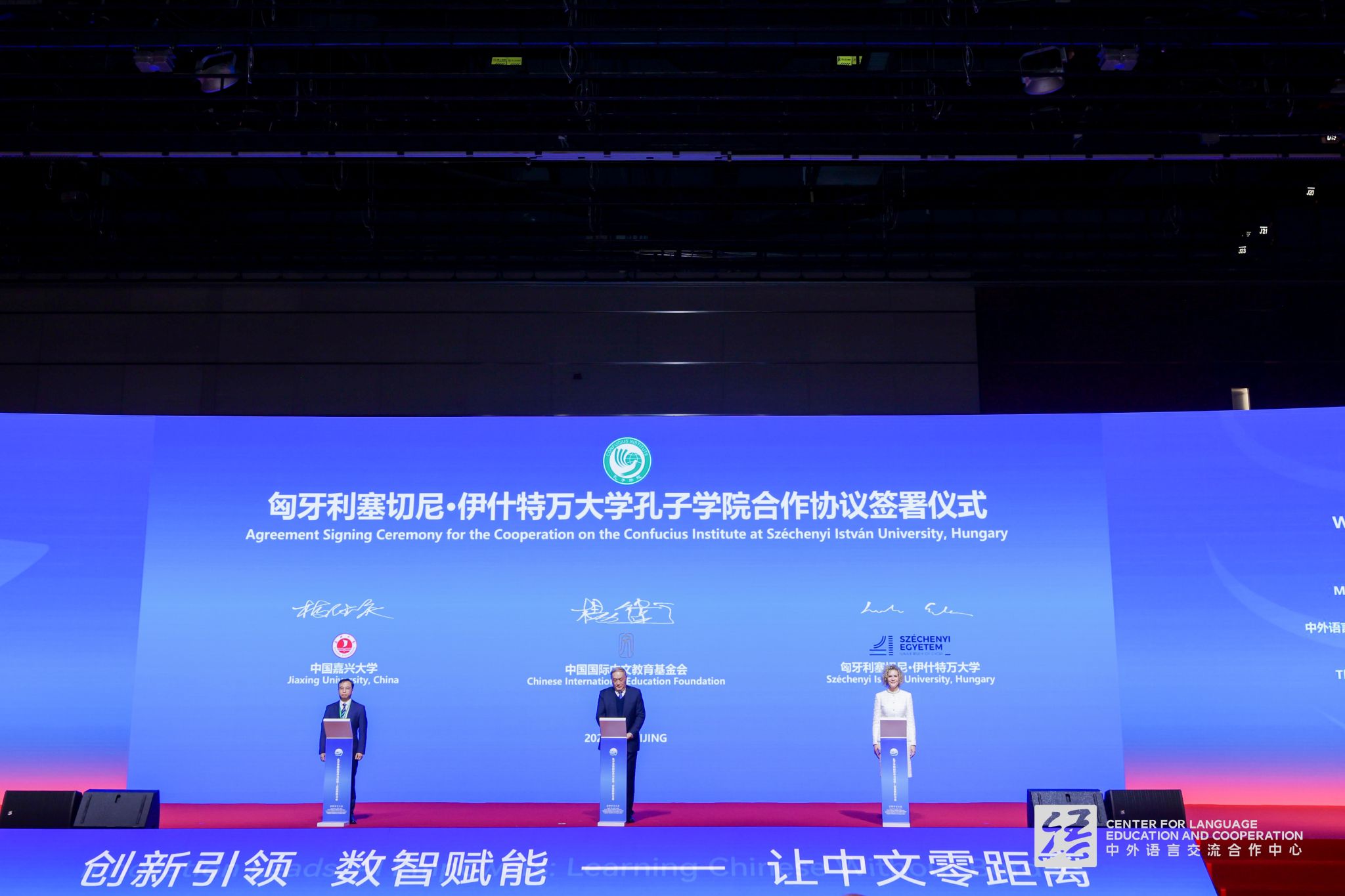 大会期间,举行了匈牙利塞切尼・伊什特万大学孔子学院合作协议签署仪式和授牌仪式。中国国际中文教育基金会理事长杨卫、嘉兴大学校长梅德庆、匈牙利塞切尼・伊什特万大学副校长埃斯特・卢卡奇作为三方代表共同签署《匈牙利塞切尼・伊什特万大学孔子学院合作协议》,标志着嘉兴大学、塞切尼・伊什特万大学两校联合申报的"中文+新技术"特色孔子学院正式落地。